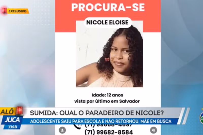 Uma adolescente de 12 anos, identificada como Nicole Eloise, sumiu na última quarta-feira (8), após ir para escola na cidade de Catu.